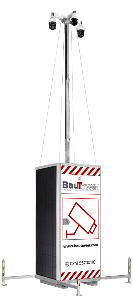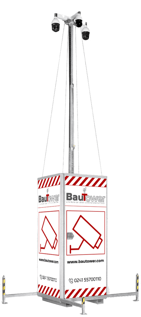 Mobile Videotürme sind mit einem Teleskopmast ausgestattet, um Überwachungsgeräte wie Kameras und Beleuchtungssysteme zu tragen. BauTower bietet die perfekte Lösung, da unsere Systeme eine bessere Sicht, eine schnelle Installation, Kosteneffizienz, eine unabhängige Stromversorgung sowie Echtzeit-Warnmeldungen gewährleisten.